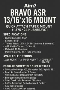 The Aim7 Bravo ASR Mount is a precision-engineered attachment system for modern suppressors using the 1.375×24 HUB / Omega / Bravo thread standard. Designed for maximum cross-compatibility, this mount interfaces with numerous major suppressor brands and allows you to run ASR mounts, taper mounts, and other modular muzzle devices.